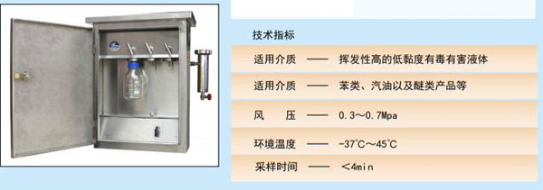 采样控制器是一种密闭循环采样的釆样控制器,该采样器采用压缩风做动力,安全防爆,全自动操作, 下拉托盘式结构。该釆样器的智能型配备密闭取样接口,对于有毒有害、易挥发的液体以及特殊要求的采 样,可以与液体密闭采样瓶配合,从而达到密闭采样的效果。密闭储罐采样器分为两种形式,一种为玻璃 瓶式密闭釆样器,另一种为钢瓶密闭釆样器,玻璃瓶密闭储雄采样器结构简单' 成本低' 安全可靠。钢瓶 密闭采样器能够自循环,不需要每次清洗釆样瓶。