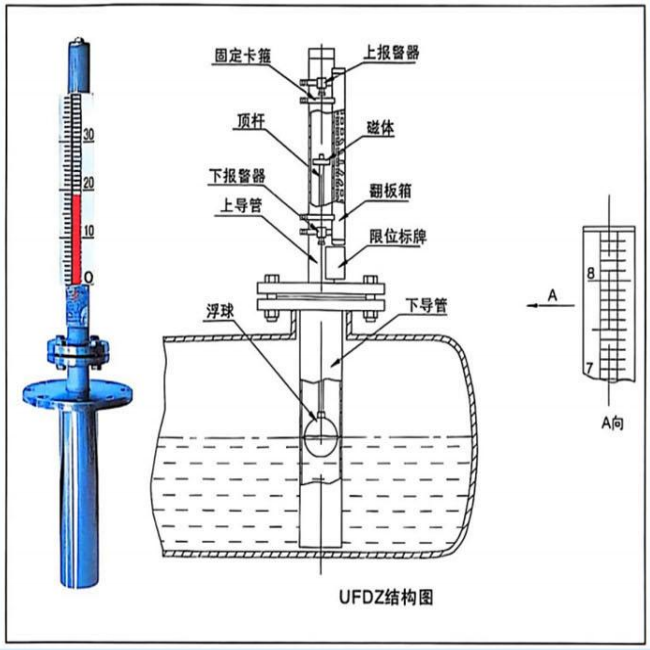 UFDZ顶装型磁性翻板液位计是应用户需要在地下容器上开孔位置要求而开发的新一代液位计,跟U1Z内装型液位相比,具有价格便宜、能适用于易燃易爆、有毒、强腐蚀性和挥发性的环境中工作,是UFZ侧装型磁性翻板液位计的特殊型具有安全可靠、观察方便、液位指示清等特点,广泛应用于油库、地下储罐、槽等容器及食品、化工、化肥等行业上,同时在该液位计上配上有关的配件,还具有报警和控制信号输出功能。