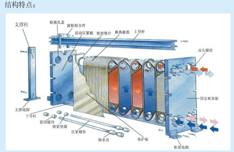 板式换热器是由框架、传热板片组及夹紧螺栓等主要部件组成。