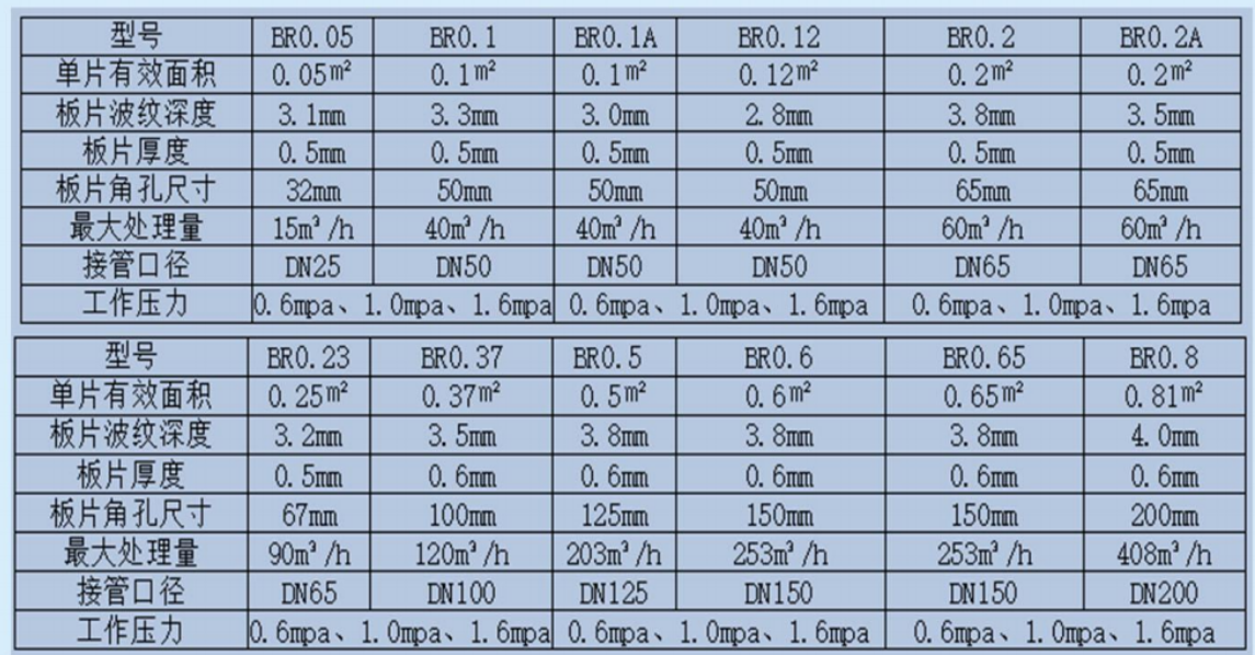 有双支撑框架式和常用落地式等,也可根据用户的要求更改框架的型式。传热板片是板式换热器的核心部件之一。波纹板片通过一次压制成型,合理的波纹设计增加了板片有效传热面积,使流体顺波纹通过时形成湍流,强化了传热过程。装配时波纹与波纹相交成大量接触抗点,大大提高了板片组的刚度,因此能承受较高的压力。每块板片作为一个传热面在密封垫的作用下,板片的两次分别有冷热介质通过,进行换热。板片上有四个分配液体的孔,孔及板片四周装有密封垫片,限制介质在板片组内流动,各板片形成平行的通道,流经里面的两种介质,作最佳换热效果的方向流动,为适应多种腐蚀性较强的介质,波纹板片材料有;工业纯钛TA1,用于海水或其它腐蚀性介质:多种不锈钢,用于淡水、饮用水、油类及其它非腐蚀性介质。在波纹板片的密封槽上装有密封垫片,密封垫片设计成双道密封结构,并且有信号孔。当介质如从第一道密封泄漏时,可从信号孔泄出设备之外,便能及早发现问题加以解决,不会造成两种介质的混合。密封垫片可根据不同的流体和操作温度选用不同的胶种。