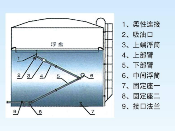 通过储罐内浮顶浮筒产生的浮力使旋转接头运动,可保证出液装置的出液吸口在储罐内随液面上下浮动,保持抽吸储罐内高液位部分的洁净液体,沉积在储罐底部液体层内的水分、杂质不会被夹带出储罐,从而保证了发放液体的质量,根据储油罐规格及尺寸,可分为单臂式浮动出液装置及双臂式浮动出液装置。材质分别为铝合金、碳钢、不锈钢等。规格为DN50-500MM。